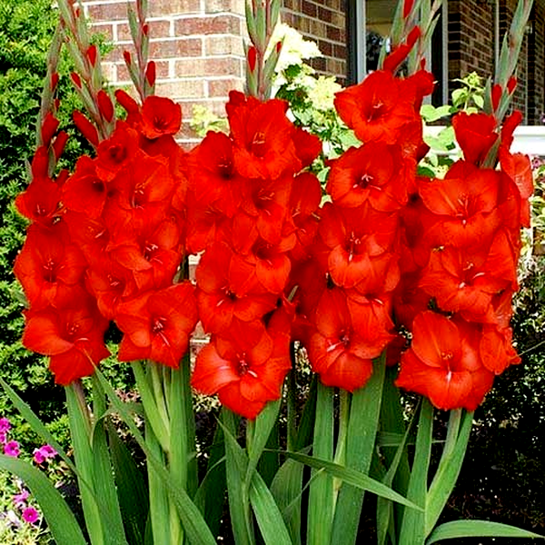 Gladiolus is a genus of perennial flowering plants that grow from corms (bulb-like underground storage organs) and are beloved for their tall, dramatic flower spikes. These striking plants produce sword-shaped leaves and towering stems that can reach 2-5 feet in height, topped with multiple funnel-shaped flowers arranged in dense, vertical clusters called racemes.