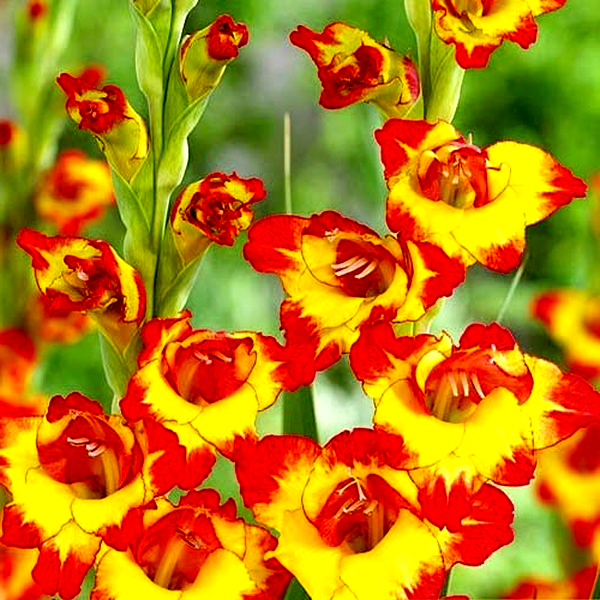 Native primarily to South Africa, with some species from the Mediterranean region, gladioli have become popular garden plants worldwide. They bloom in summer and are prized as cut flowers due to their impressive height and long-lasting blooms. The plants prefer full sun and well-drained soil, and in colder climates, the corms must be lifted and stored indoors during winter. Gladioli are excellent for creating dramatic vertical elements in flower gardens and are commonly grown in rows for cutting. There are over 260 species and countless cultivars, ranging from miniature varieties to giant exhibition types.