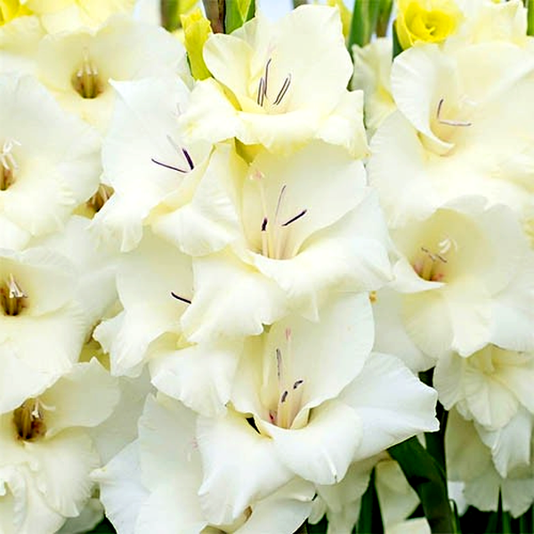 Gladiolus is a genus of perennial flowering plants that grow from corms (bulb-like underground storage organs) and are beloved for their tall, dramatic flower spikes. These striking plants produce sword-shaped leaves and towering stems that can reach 2-5 feet in height, topped with multiple funnel-shaped flowers arranged in dense, vertical clusters called racemes.
