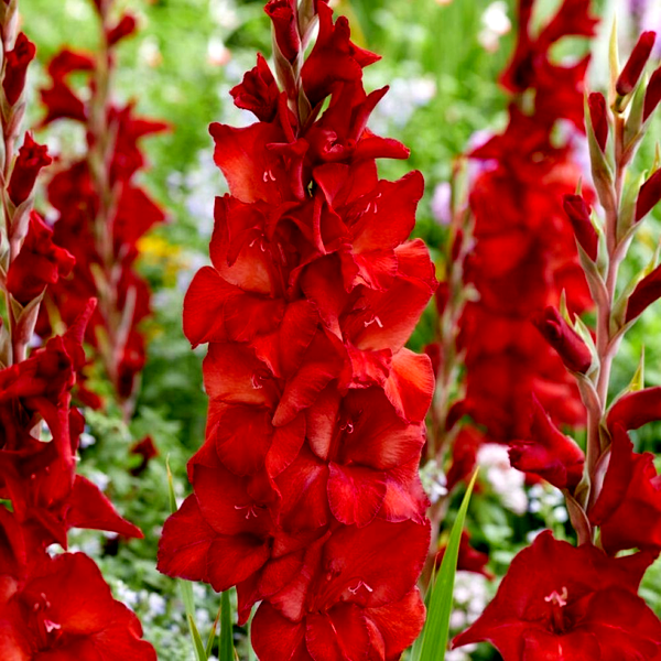 Native primarily to South Africa, with some species from the Mediterranean region, gladioli have become popular garden plants worldwide. They bloom in summer and are prized as cut flowers due to their impressive height and long-lasting blooms. The plants prefer full sun and well-drained soil, and in colder climates, the corms must be lifted and stored indoors during winter. Gladioli are excellent for creating dramatic vertical elements in flower gardens and are commonly grown in rows for cutting. There are over 260 species and countless cultivars, ranging from miniature varieties to giant exhibition types.