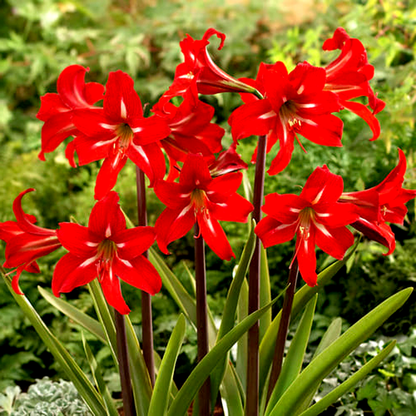 The plant grows from a large, rounded bulb that sends up a thick, hollow flower stalk called a scape, which can reach 12-24 inches tall. Each stalk typically bears 2-6 large, lily-like flowers that bloom in succession. The strap-shaped leaves are glossy green and usually emerge after or alongside the flowers, growing up to 18 inches long.