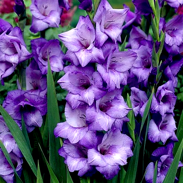 Gladiolus is a genus of perennial flowering plants that grow from corms (bulb-like underground storage organs) and are beloved for their tall, dramatic flower spikes. These striking plants produce sword-shaped leaves and towering stems that can reach 2-5 feet in height, topped with multiple funnel-shaped flowers arranged in dense, vertical clusters called racemes.