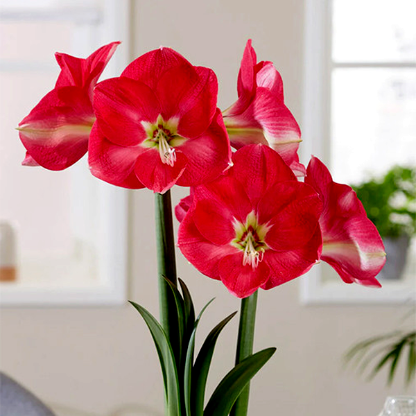 The plant grows from a large, rounded bulb that sends up a thick, hollow flower stalk called a scape, which can reach 12-24 inches tall. Each stalk typically bears 2-6 large, lily-like flowers that bloom in succession. The strap-shaped leaves are glossy green and usually emerge after or alongside the flowers, growing up to 18 inches long.