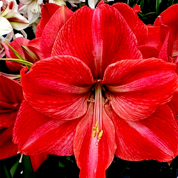 Amaryllis is a striking bulbous flowering plant best known for its large, trumpet-shaped blooms that make it a popular choice for indoor flowering during winter months. The most commonly cultivated species, Hippeastrum (often called amaryllis in horticulture), produces dramatic flowers that can reach 6-8 inches across, typically in shades of red, pink, white, orange, or striped combinations.