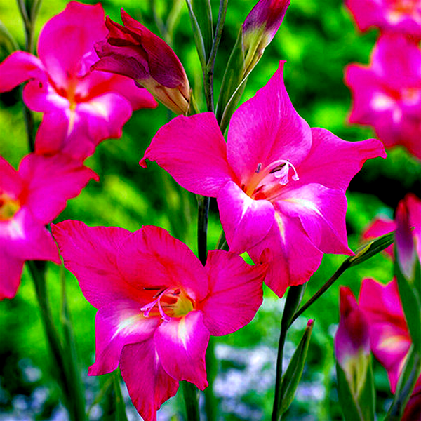 Native primarily to South Africa, with some species from the Mediterranean region, gladioli have become popular garden plants worldwide. They bloom in summer and are prized as cut flowers due to their impressive height and long-lasting blooms. The plants prefer full sun and well-drained soil, and in colder climates, the corms must be lifted and stored indoors during winter. Gladioli are excellent for creating dramatic vertical elements in flower gardens and are commonly grown in rows for cutting. There are over 260 species and countless cultivars, ranging from miniature varieties to giant exhibition types.