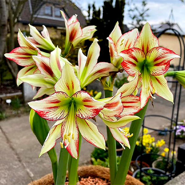 The plant grows from a large, rounded bulb that sends up a thick, hollow flower stalk called a scape, which can reach 12-24 inches tall. Each stalk typically bears 2-6 large, lily-like flowers that bloom in succession. The strap-shaped leaves are glossy green and usually emerge after or alongside the flowers, growing up to 18 inches long.