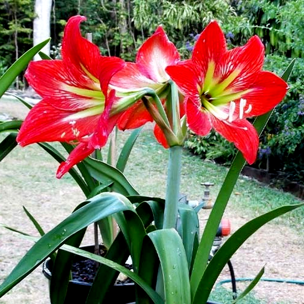 The plant grows from a large, rounded bulb that sends up a thick, hollow flower stalk called a scape, which can reach 12-24 inches tall. Each stalk typically bears 2-6 large, lily-like flowers that bloom in succession. The strap-shaped leaves are glossy green and usually emerge after or alongside the flowers, growing up to 18 inches long.