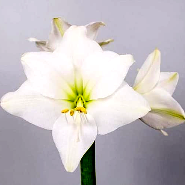 The plant grows from a large, rounded bulb that sends up a thick, hollow flower stalk called a scape, which can reach 12-24 inches tall. Each stalk typically bears 2-6 large, lily-like flowers that bloom in succession. The strap-shaped leaves are glossy green and usually emerge after or alongside the flowers, growing up to 18 inches long.