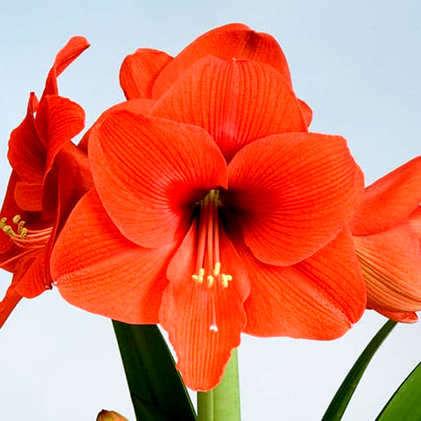The plant grows from a large, rounded bulb that sends up a thick, hollow flower stalk called a scape, which can reach 12-24 inches tall. Each stalk typically bears 2-6 large, lily-like flowers that bloom in succession. The strap-shaped leaves are glossy green and usually emerge after or alongside the flowers, growing up to 18 inches long.