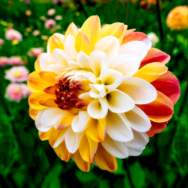 Dahlias grow from underground tubers and typically reach heights of 1-6 feet, depending on the variety. They bloom from midsummer until the first frost, making them valuable for extended garden color. The plants prefer full sun and well-drained, fertile soil. In colder climates, the tubers must be lifted and stored indoors during winter. Dahlias are excellent for cut flowers and are popular in both cottage gardens and formal landscapes. There are over 40 species and thousands of cultivars, making them one of the most diverse flowering plants available to gardeners.