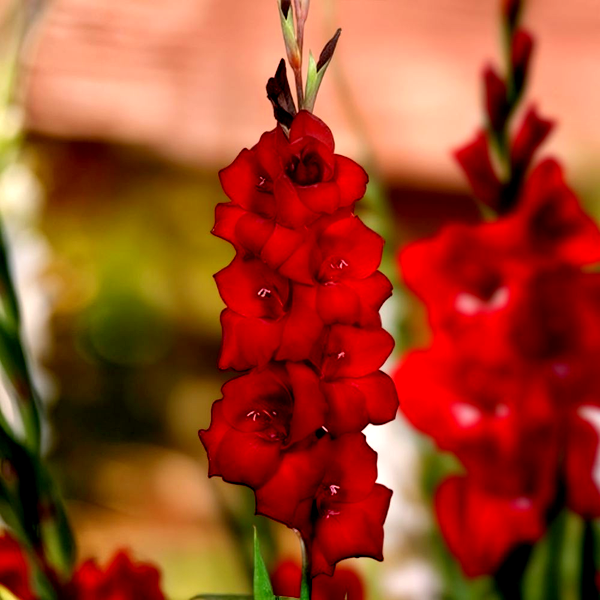 Gladiolus is a genus of perennial flowering plants that grow from corms (bulb-like underground storage organs) and are beloved for their tall, dramatic flower spikes. These striking plants produce sword-shaped leaves and towering stems that can reach 2-5 feet in height, topped with multiple funnel-shaped flowers arranged in dense, vertical clusters called racemes.