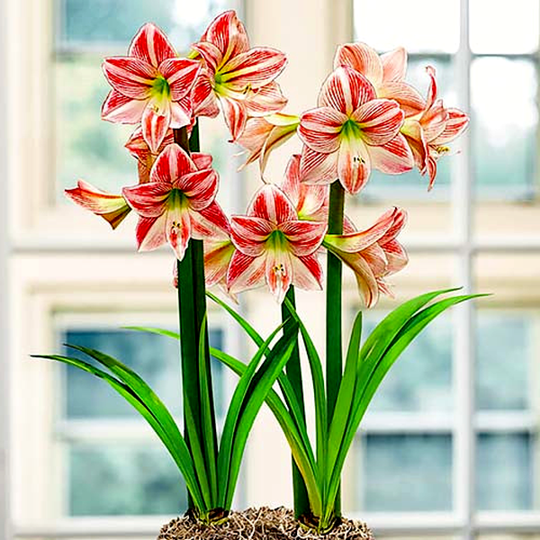 The plant grows from a large, rounded bulb that sends up a thick, hollow flower stalk called a scape, which can reach 12-24 inches tall. Each stalk typically bears 2-6 large, lily-like flowers that bloom in succession. The strap-shaped leaves are glossy green and usually emerge after or alongside the flowers, growing up to 18 inches long.