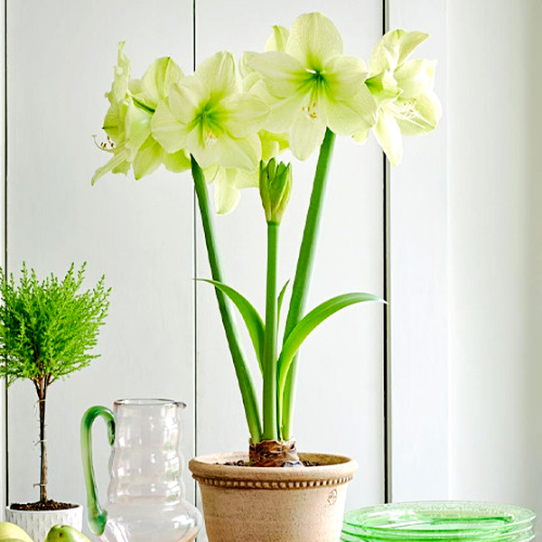 The plant grows from a large, rounded bulb that sends up a thick, hollow flower stalk called a scape, which can reach 12-24 inches tall. Each stalk typically bears 2-6 large, lily-like flowers that bloom in succession. The strap-shaped leaves are glossy green and usually emerge after or alongside the flowers, growing up to 18 inches long.