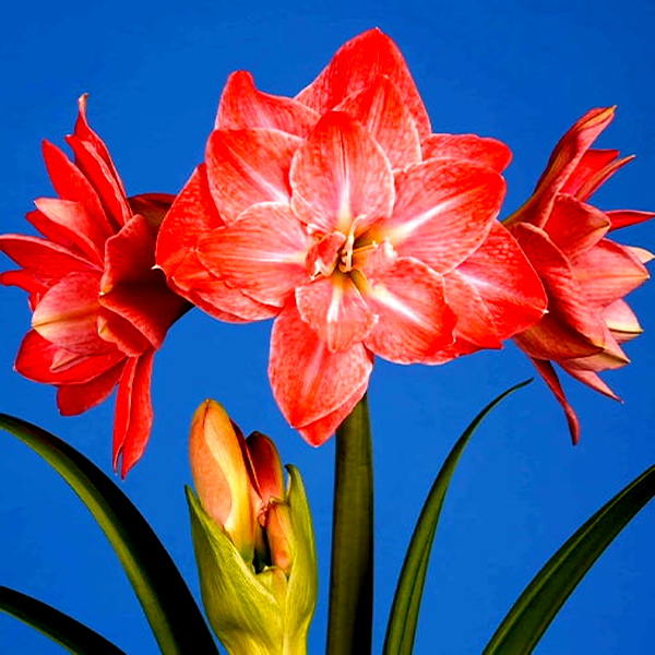 The plant grows from a large, rounded bulb that sends up a thick, hollow flower stalk called a scape, which can reach 12-24 inches tall. Each stalk typically bears 2-6 large, lily-like flowers that bloom in succession. The strap-shaped leaves are glossy green and usually emerge after or alongside the flowers, growing up to 18 inches long.