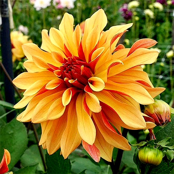 Dahlias grow from underground tubers and typically reach heights of 1-6 feet, depending on the variety. They bloom from midsummer until the first frost, making them valuable for extended garden color. The plants prefer full sun and well-drained, fertile soil. In colder climates, the tubers must be lifted and stored indoors during winter. Dahlias are excellent for cut flowers and are popular in both cottage gardens and formal landscapes. There are over 40 species and thousands of cultivars, making them one of the most diverse flowering plants available to gardeners.
