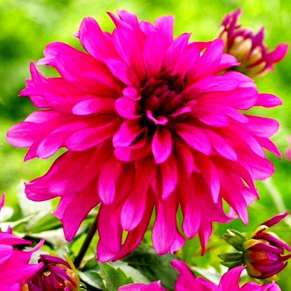 Dahlias grow from underground tubers and typically reach heights of 1-6 feet, depending on the variety. They bloom from midsummer until the first frost, making them valuable for extended garden color. The plants prefer full sun and well-drained, fertile soil. In colder climates, the tubers must be lifted and stored indoors during winter. Dahlias are excellent for cut flowers and are popular in both cottage gardens and formal landscapes. There are over 40 species and thousands of cultivars, making them one of the most diverse flowering plants available to gardeners.