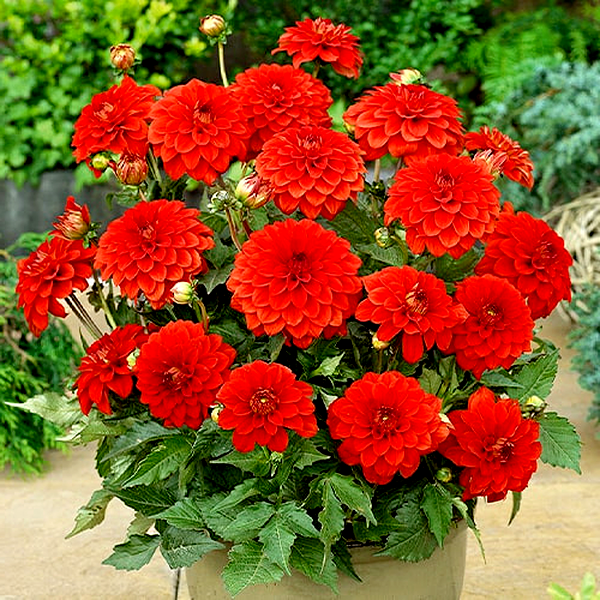 Dahlias grow from underground tubers and typically reach heights of 1-6 feet, depending on the variety. They bloom from midsummer until the first frost, making them valuable for extended garden color. The plants prefer full sun and well-drained, fertile soil. In colder climates, the tubers must be lifted and stored indoors during winter. Dahlias are excellent for cut flowers and are popular in both cottage gardens and formal landscapes. There are over 40 species and thousands of cultivars, making them one of the most diverse flowering plants available to gardeners.