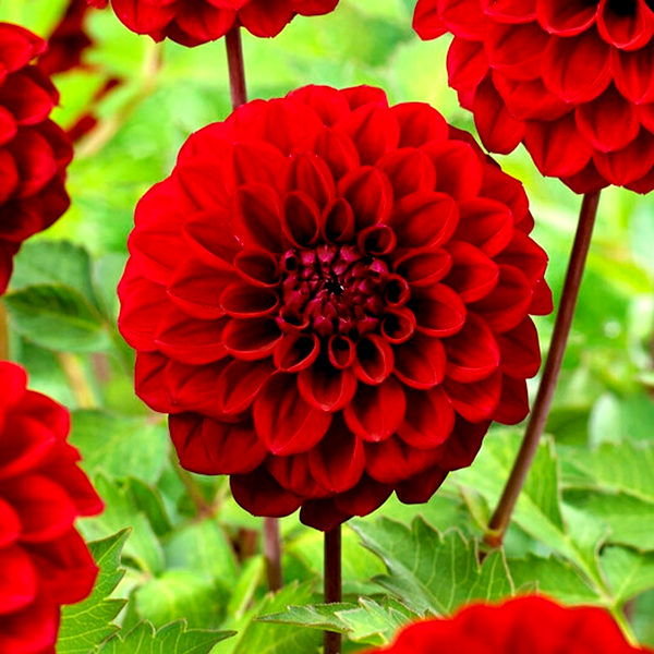 Dahlias grow from underground tubers and typically reach heights of 1-6 feet, depending on the variety. They bloom from midsummer until the first frost, making them valuable for extended garden color. The plants prefer full sun and well-drained, fertile soil. In colder climates, the tubers must be lifted and stored indoors during winter. Dahlias are excellent for cut flowers and are popular in both cottage gardens and formal landscapes. There are over 40 species and thousands of cultivars, making them one of the most diverse flowering plants available to gardeners.