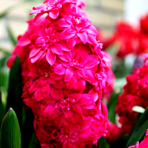 Hyacinths are fragrant spring-blooming bulbs known for their dense, cylindrical flower spikes and intense sweet perfume. These bulbs produce sturdy stems topped with clusters of small, waxy flowers in vibrant colors including deep purple, pink, white, yellow, orange, and various shades of blue.