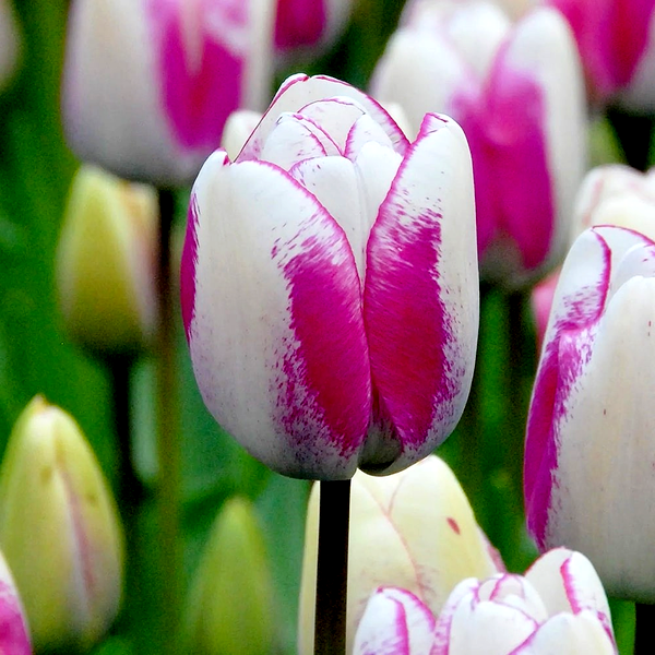 Tulips are iconic spring-blooming bulbs renowned for their elegant cup-shaped flowers and wide array of colors and forms. These bulbs produce single stems with distinctive flowers that can be found in virtually every color except true blue, including solid hues, bi-colors, and striking patterns with stripes, flames, or picotee edges.