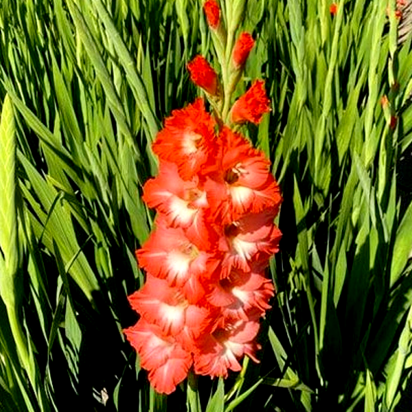 Gladiolus is a genus of perennial flowering plants that grow from corms (bulb-like underground storage organs) and are beloved for their tall, dramatic flower spikes. These striking plants produce sword-shaped leaves and towering stems that can reach 2-5 feet in height, topped with multiple funnel-shaped flowers arranged in dense, vertical clusters called racemes.