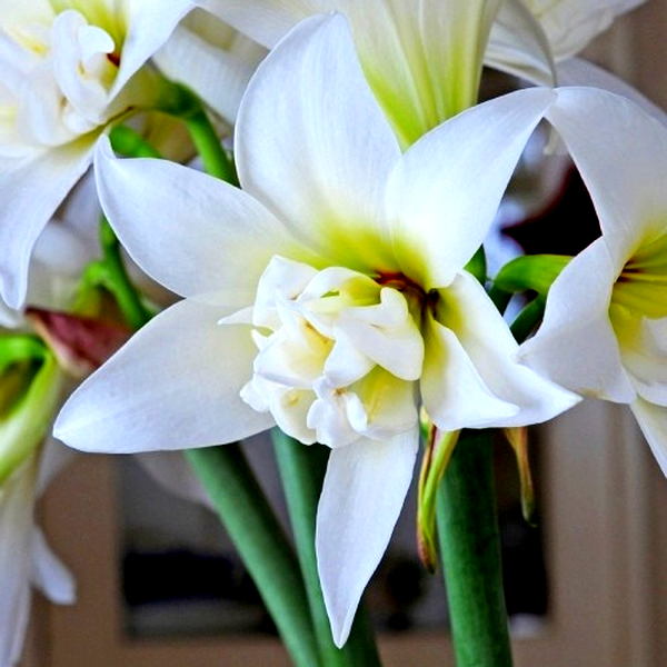The plant grows from a large, rounded bulb that sends up a thick, hollow flower stalk called a scape, which can reach 12-24 inches tall. Each stalk typically bears 2-6 large, lily-like flowers that bloom in succession. The strap-shaped leaves are glossy green and usually emerge after or alongside the flowers, growing up to 18 inches long.