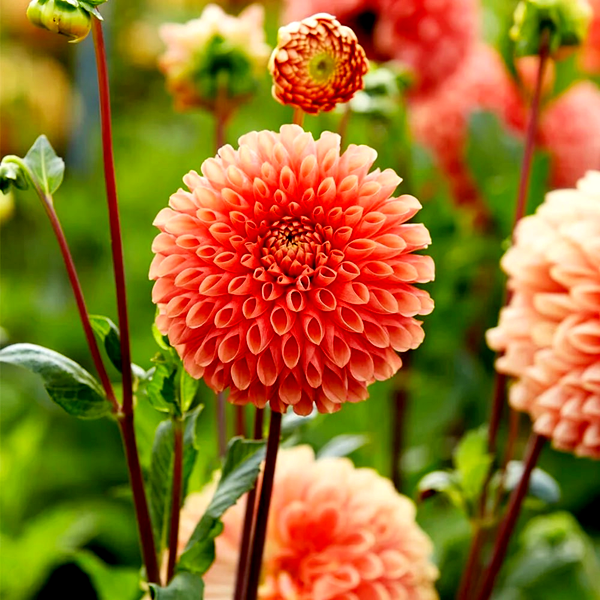 Dahlias grow from underground tubers and typically reach heights of 1-6 feet, depending on the variety. They bloom from midsummer until the first frost, making them valuable for extended garden color. The plants prefer full sun and well-drained, fertile soil. In colder climates, the tubers must be lifted and stored indoors during winter. Dahlias are excellent for cut flowers and are popular in both cottage gardens and formal landscapes. There are over 40 species and thousands of cultivars, making them one of the most diverse flowering plants available to gardeners.