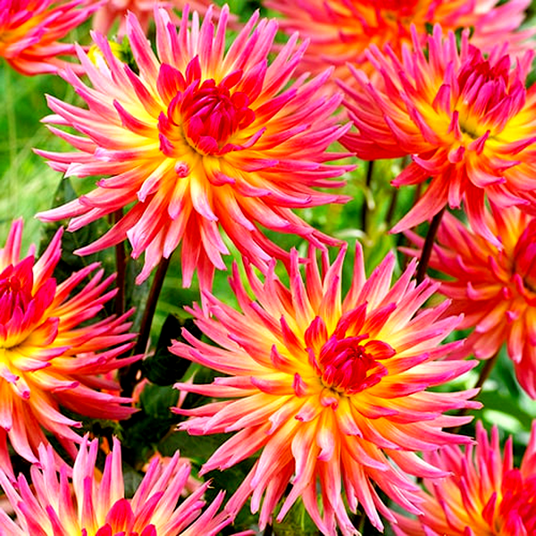 Dahlias grow from underground tubers and typically reach heights of 1-6 feet, depending on the variety. They bloom from midsummer until the first frost, making them valuable for extended garden color. The plants prefer full sun and well-drained, fertile soil. In colder climates, the tubers must be lifted and stored indoors during winter. Dahlias are excellent for cut flowers and are popular in both cottage gardens and formal landscapes. There are over 40 species and thousands of cultivars, making them one of the most diverse flowering plants available to gardeners.