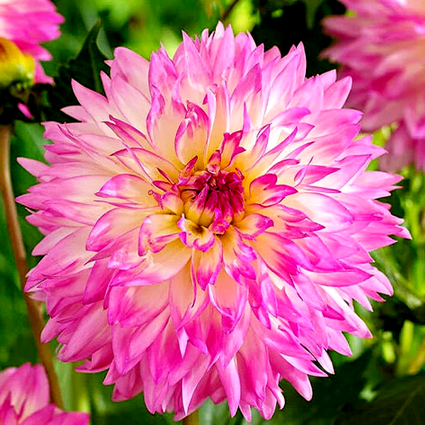 Dahlias grow from underground tubers and typically reach heights of 1-6 feet, depending on the variety. They bloom from midsummer until the first frost, making them valuable for extended garden color. The plants prefer full sun and well-drained, fertile soil. In colder climates, the tubers must be lifted and stored indoors during winter. Dahlias are excellent for cut flowers and are popular in both cottage gardens and formal landscapes. There are over 40 species and thousands of cultivars, making them one of the most diverse flowering plants available to gardeners.
