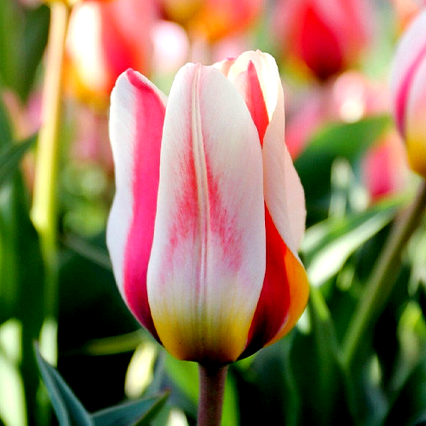 Tulips are iconic spring-blooming bulbs renowned for their elegant cup-shaped flowers and wide array of colors and forms. These bulbs produce single stems with distinctive flowers that can be found in virtually every color except true blue, including solid hues, bi-colors, and striking patterns with stripes, flames, or picotee edges.