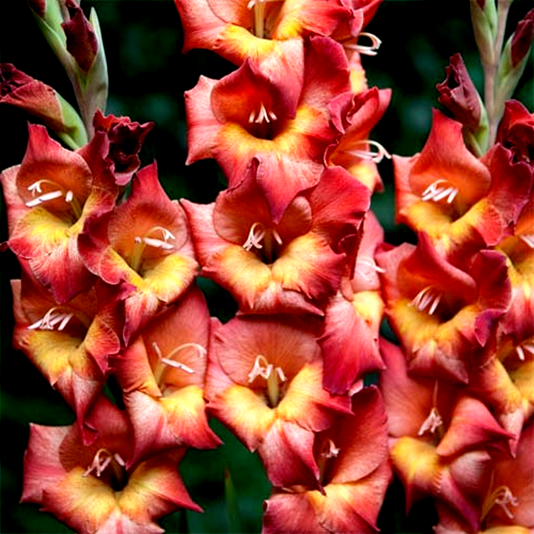Gladiolus is a genus of perennial flowering plants that grow from corms (bulb-like underground storage organs) and are beloved for their tall, dramatic flower spikes. These striking plants produce sword-shaped leaves and towering stems that can reach 2-5 feet in height, topped with multiple funnel-shaped flowers arranged in dense, vertical clusters called racemes.