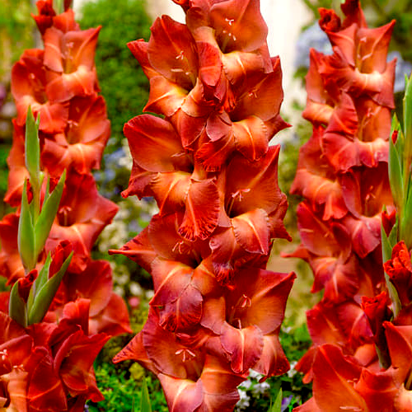 Gladiolus is a genus of perennial flowering plants that grow from corms (bulb-like underground storage organs) and are beloved for their tall, dramatic flower spikes. These striking plants produce sword-shaped leaves and towering stems that can reach 2-5 feet in height, topped with multiple funnel-shaped flowers arranged in dense, vertical clusters called racemes.