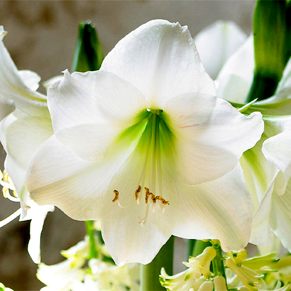 The plant grows from a large, rounded bulb that sends up a thick, hollow flower stalk called a scape, which can reach 12-24 inches tall. Each stalk typically bears 2-6 large, lily-like flowers that bloom in succession. The strap-shaped leaves are glossy green and usually emerge after or alongside the flowers, growing up to 18 inches long.