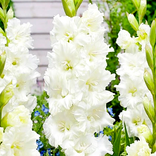 The flowers bloom sequentially from bottom to top along the spike, creating an extended flowering period. Gladioli come in virtually every color except true blue, including vibrant reds, pinks, yellows, oranges, purples, whites, and many bi-colored or ruffled varieties. Each individual flower typically measures 3-5 inches across and has six petals with prominent stamens.