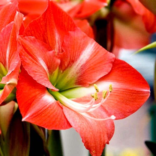 Amaryllis is a striking bulbous flowering plant best known for its large, trumpet-shaped blooms that make it a popular choice for indoor flowering during winter months. The most commonly cultivated species, Hippeastrum (often called amaryllis in horticulture), produces dramatic flowers that can reach 6-8 inches across, typically in shades of red, pink, white, orange, or striped combinations.