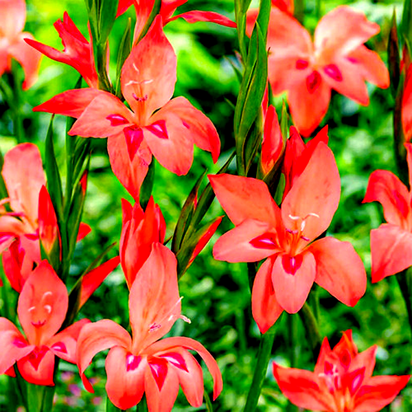 Native primarily to South Africa, with some species from the Mediterranean region, gladioli have become popular garden plants worldwide. They bloom in summer and are prized as cut flowers due to their impressive height and long-lasting blooms. The plants prefer full sun and well-drained soil, and in colder climates, the corms must be lifted and stored indoors during winter. Gladioli are excellent for creating dramatic vertical elements in flower gardens and are commonly grown in rows for cutting. There are over 260 species and countless cultivars, ranging from miniature varieties to giant exhibition types.