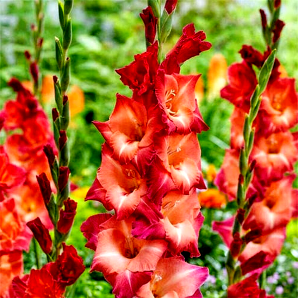Native primarily to South Africa, with some species from the Mediterranean region, gladioli have become popular garden plants worldwide. They bloom in summer and are prized as cut flowers due to their impressive height and long-lasting blooms. The plants prefer full sun and well-drained soil, and in colder climates, the corms must be lifted and stored indoors during winter. Gladioli are excellent for creating dramatic vertical elements in flower gardens and are commonly grown in rows for cutting. There are over 260 species and countless cultivars, ranging from miniature varieties to giant exhibition types.