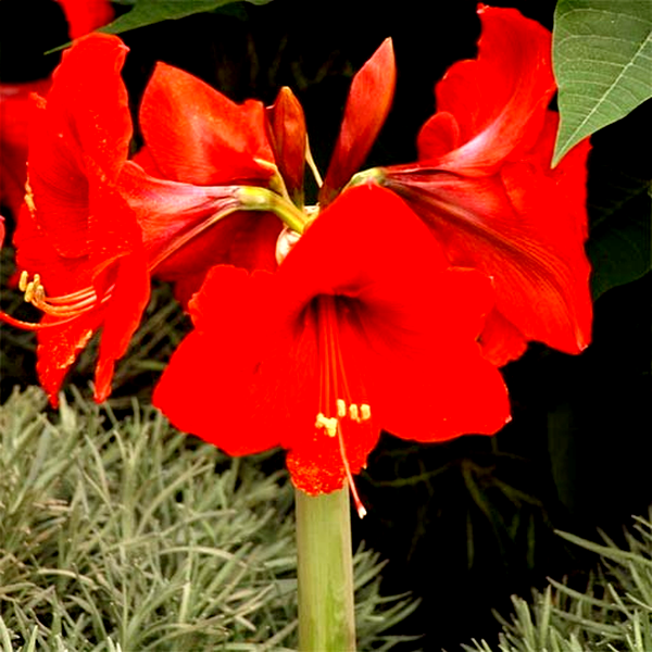 The plant grows from a large, rounded bulb that sends up a thick, hollow flower stalk called a scape, which can reach 12-24 inches tall. Each stalk typically bears 2-6 large, lily-like flowers that bloom in succession. The strap-shaped leaves are glossy green and usually emerge after or alongside the flowers, growing up to 18 inches long.