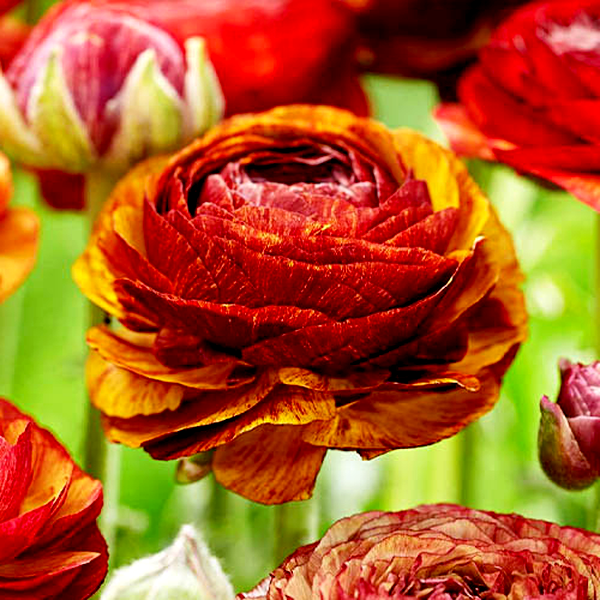 In cultivation, the Persian buttercup (Ranunculus asiaticus) has been developed into spectacular garden flowers with densely layered, papery petals that create full, rose-like blooms in vibrant colors including pink, red, orange, yellow, and white. These cultivated varieties are popular in wedding bouquets and floral arrangements for their romantic, ruffled appearance and long-lasting blooms.