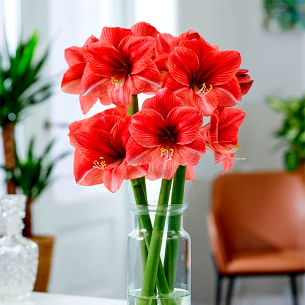 Amaryllis is a striking bulbous flowering plant best known for its large, trumpet-shaped blooms that make it a popular choice for indoor flowering during winter months. The most commonly cultivated species, Hippeastrum (often called amaryllis in horticulture), produces dramatic flowers that can reach 6-8 inches across, typically in shades of red, pink, white, orange, or striped combinations.