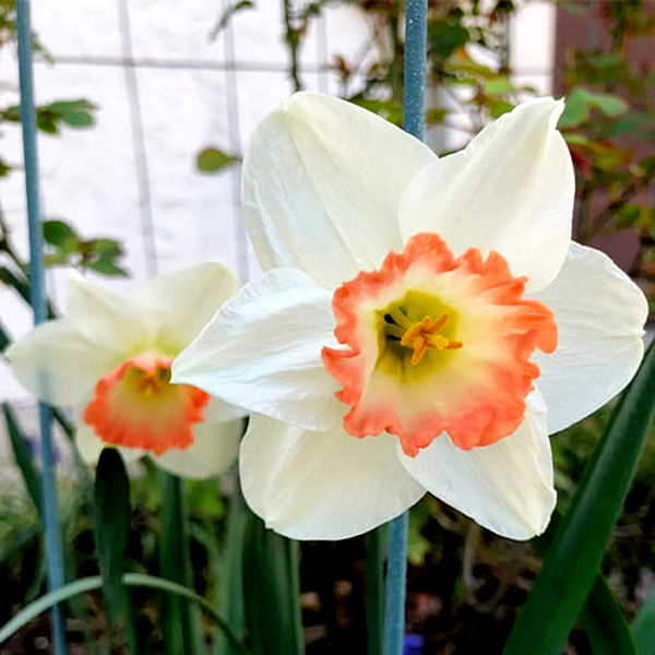 The classic narcissus flower features six outer petals (technically tepals) surrounding a central corona or "trumpet" that can be short like a cup or long and flared. This unique structure creates their instantly recognizable silhouette. Colors range from pure white and sunny yellow to combinations of cream, orange, pink, and even green, with many varieties featuring contrasting coronas that add visual interest.