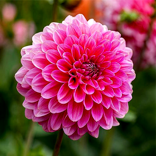 Dahlias grow from underground tubers and typically reach heights of 1-6 feet, depending on the variety. They bloom from midsummer until the first frost, making them valuable for extended garden color. The plants prefer full sun and well-drained, fertile soil. In colder climates, the tubers must be lifted and stored indoors during winter. Dahlias are excellent for cut flowers and are popular in both cottage gardens and formal landscapes. There are over 40 species and thousands of cultivars, making them one of the most diverse flowering plants available to gardeners.