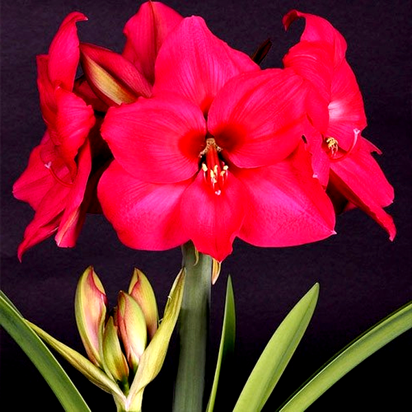 The plant grows from a large, rounded bulb that sends up a thick, hollow flower stalk called a scape, which can reach 12-24 inches tall. Each stalk typically bears 2-6 large, lily-like flowers that bloom in succession. The strap-shaped leaves are glossy green and usually emerge after or alongside the flowers, growing up to 18 inches long.
