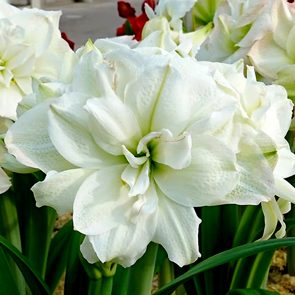The plant grows from a large, rounded bulb that sends up a thick, hollow flower stalk called a scape, which can reach 12-24 inches tall. Each stalk typically bears 2-6 large, lily-like flowers that bloom in succession. The strap-shaped leaves are glossy green and usually emerge after or alongside the flowers, growing up to 18 inches long.