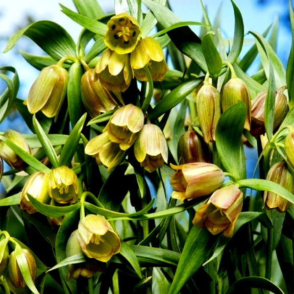 The flowers typically nod downward, hanging like lanterns from sturdy stems, and many species emit a subtle, sometimes musky fragrance. In gardens, fritillarias are prized for their unusual beauty and architectural form, though they can be challenging to grow as they often require specific soil conditions and may take several years to establish.