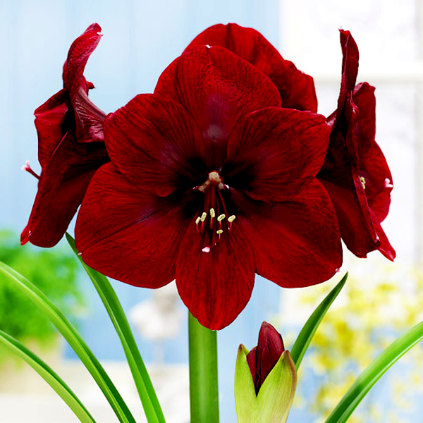 The plant grows from a large, rounded bulb that sends up a thick, hollow flower stalk called a scape, which can reach 12-24 inches tall. Each stalk typically bears 2-6 large, lily-like flowers that bloom in succession. The strap-shaped leaves are glossy green and usually emerge after or alongside the flowers, growing up to 18 inches long.