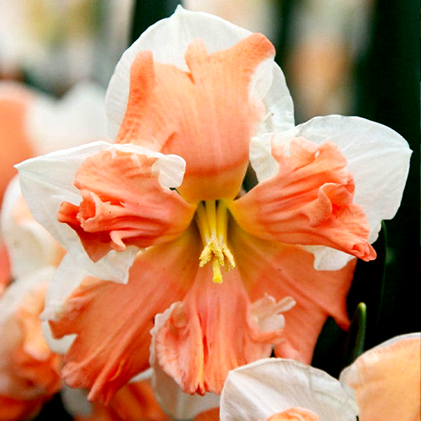 The classic narcissus flower features six outer petals (technically tepals) surrounding a central corona or "trumpet" that can be short like a cup or long and flared. This unique structure creates their instantly recognizable silhouette. Colors range from pure white and sunny yellow to combinations of cream, orange, pink, and even green, with many varieties featuring contrasting coronas that add visual interest.