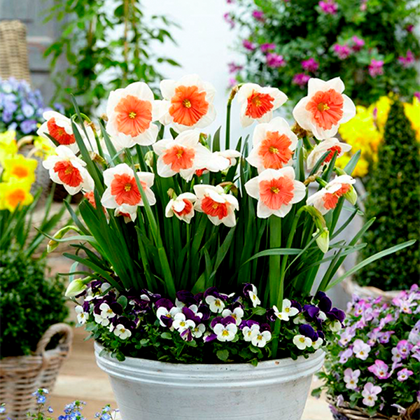 The classic narcissus flower features six outer petals (technically tepals) surrounding a central corona or "trumpet" that can be short like a cup or long and flared. This unique structure creates their instantly recognizable silhouette. Colors range from pure white and sunny yellow to combinations of cream, orange, pink, and even green, with many varieties featuring contrasting coronas that add visual interest.