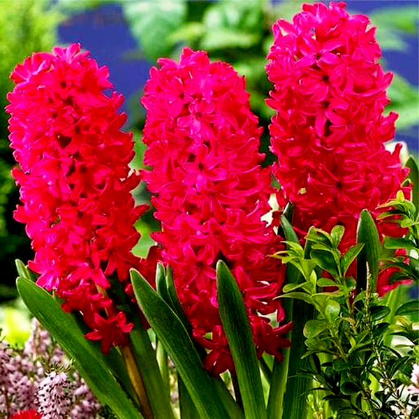 Hyacinths are fragrant spring-blooming bulbs known for their dense, cylindrical flower spikes and intense sweet perfume. These bulbs produce sturdy stems topped with clusters of small, waxy flowers in vibrant colors including deep purple, pink, white, yellow, orange, and various shades of blue.