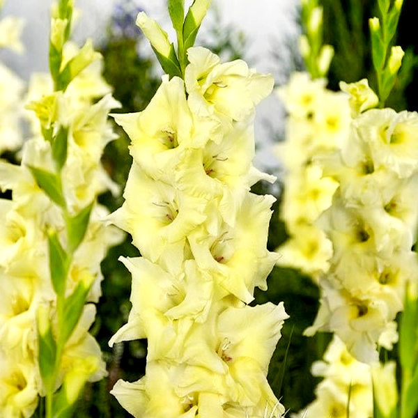 Gladiolus is a genus of perennial flowering plants that grow from corms (bulb-like underground storage organs) and are beloved for their tall, dramatic flower spikes. These striking plants produce sword-shaped leaves and towering stems that can reach 2-5 feet in height, topped with multiple funnel-shaped flowers arranged in dense, vertical clusters called racemes.